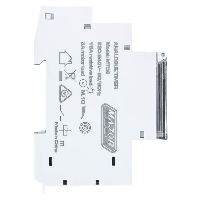 The MTD2 24 Hour Analogue Timer is a reliable and easy-to-use DIN rail mountable 16A time switch, ideal for automating electrical systems such as geysers, lighting, pool pumps, and other appliances. With 24-hour programmable switching, it allows precise control of electrical loads up to 16A, offering improved energy efficiency and operational convenience. The timer features 96 adjustable pins for daily settings, providing a minimum switching time of 15 minutes per pin. It includes a manual override function for flexible operation and an integrated 100-hour battery backup to maintain functionality during power outages. Designed for durability and performance, the MTD2 operates with a very efficient standby consumption of 0.5W, with a robust load rating of up to 2300W (Resistive load) and a constant 920W (Inductive load for Motors), and is built to meet stringent safety and installation standards.
