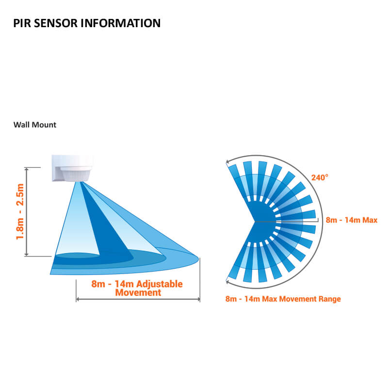The PIR49 automatically turns on lights or any electrical device within the sensors rated load, when motion and body heat is detected. It has a 240° detection range and adjustable settings for time, Lux level and sensitivity, easily integrated into new or existing installations. With an IP65 rating, the sensor is intended for indoor or outdoor installations. Installation must be done by a qualified electrician.