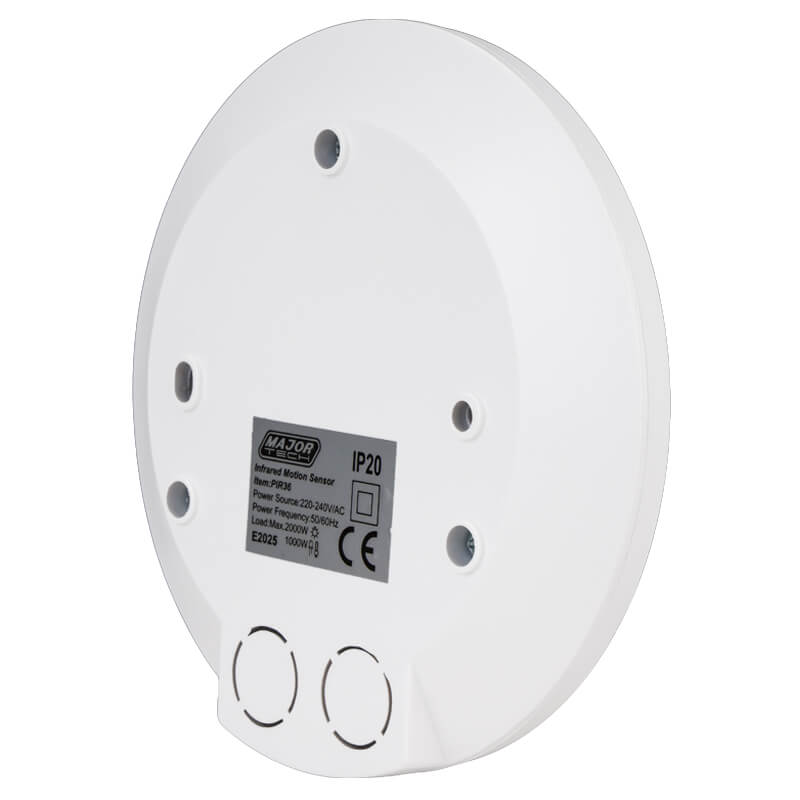 The PIR36 automatically turns on lights or any electrical device within the sensors rated load, when motion and body heat is detected. It has a 360° detection range and adjustable settings, easily integrated into new or existing installations. With an IP20 rating, the sensor is intended for indoor installations. Installation must be done by a qualified electrician.